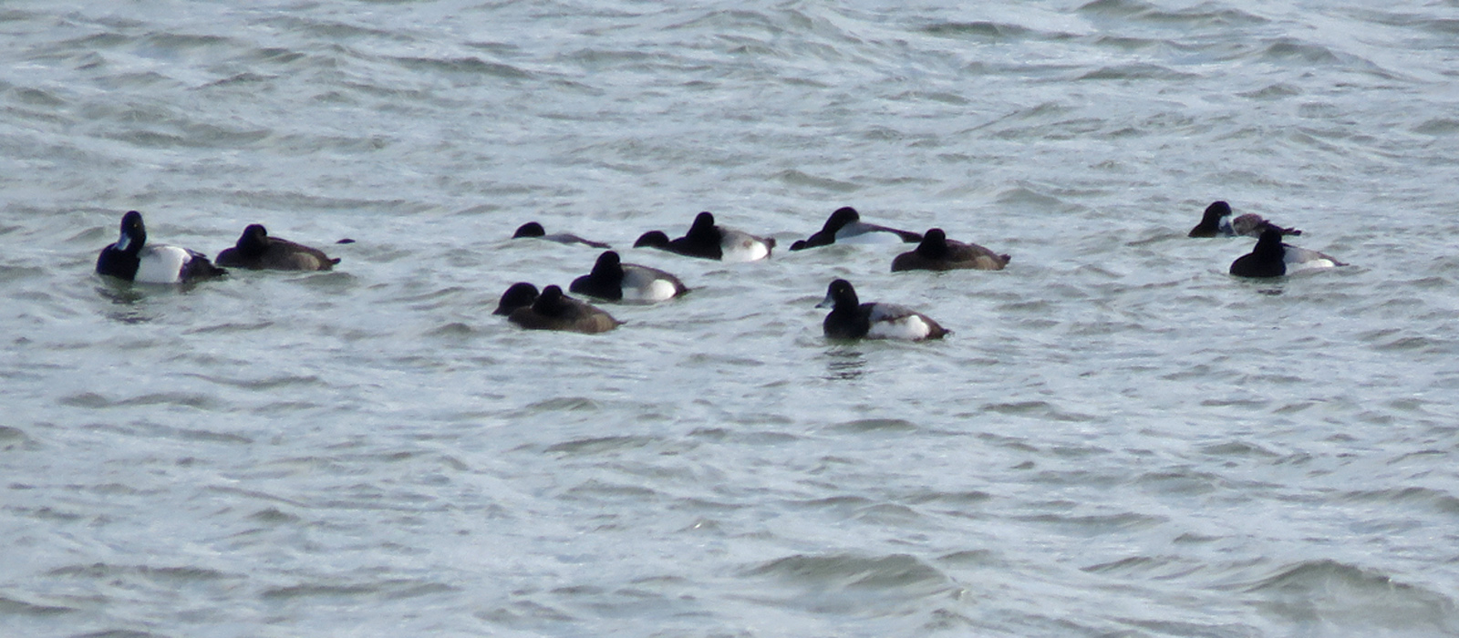 On Lake Michigan, a large raft of COMMON GOLDENEYES was present. Carefully scanning the flock, we soon spotted a LONG-TAILED DUCK, followed by a WHITE-WINGED SCOTER – and a moment later four others were also found! They were distant, and diving periodically, but eventually everyone was able to get scope views. Also present were AMERICAN HERRING GULLS, and a few RING-BILLS flew right over the parking area.