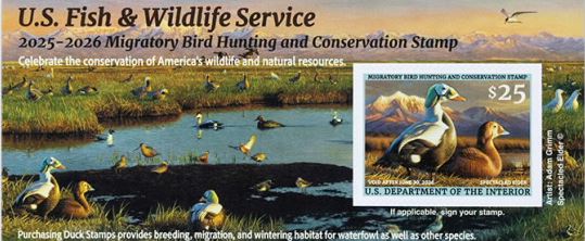 Conservationists buy them because the stamp is one of the best investments they can make in the future of America’s wetlands. Some 98% of the proceeds go to secure wetland and grassland habitat. Birders and other outdoor enthusiasts also buy them to gain free admission to National Wildlife Refuges. The 2025-26 stamp is valid between July 1, 2025, and June 30, 2026.