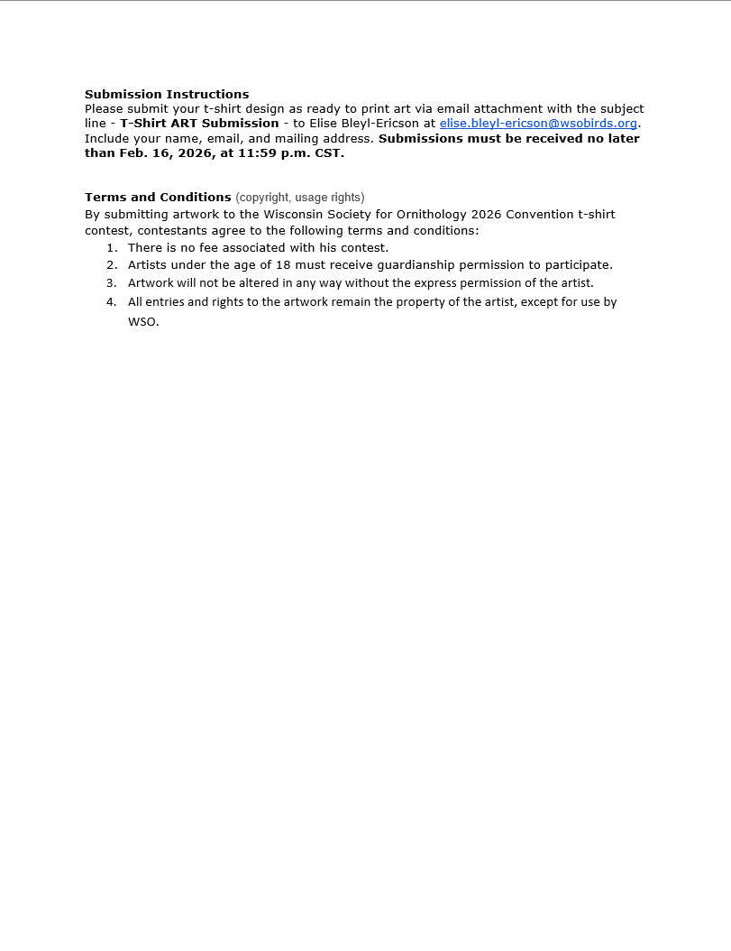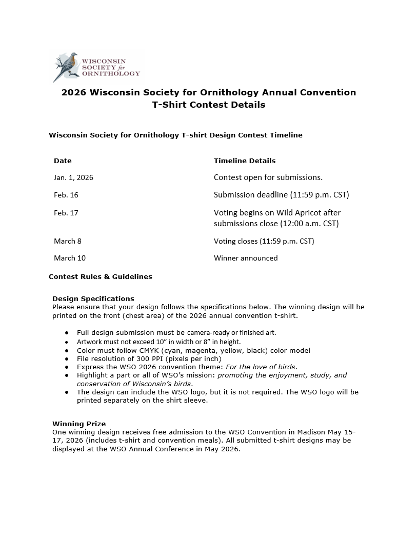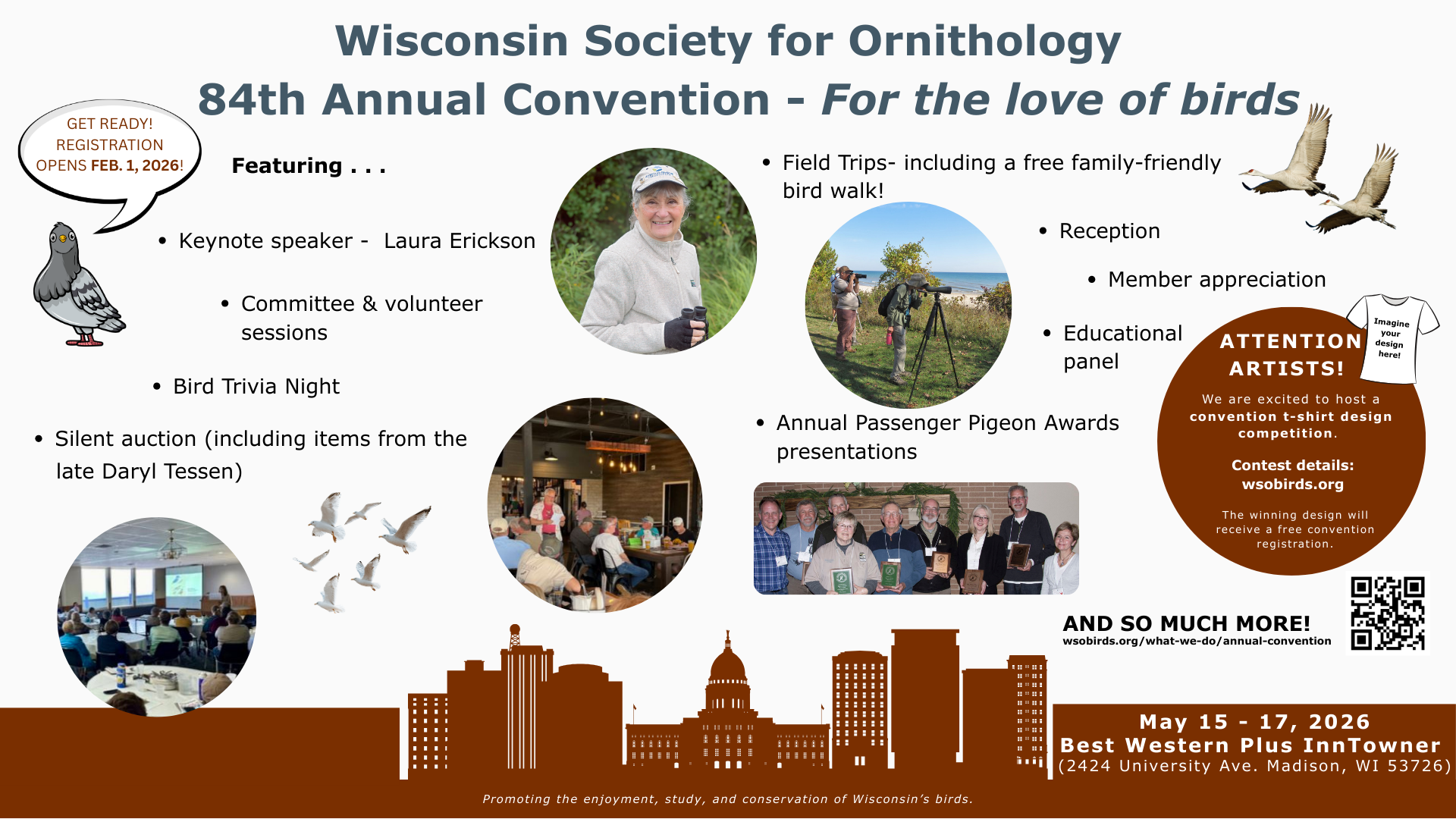 Wisconsin Society for Ornithology provides opportunities for all people to enjoy resident and migratory birds while being a leading steward of and ambassador for Wisconsin birds. WSO sponsors birding field trips throughout the year, hosts an annual birding convention, publishes a quarterly journal and monthly newsletter, offers research grants, and serves as an informational resource center on bird-related issues. Explore the sections below to learn more about what we do!