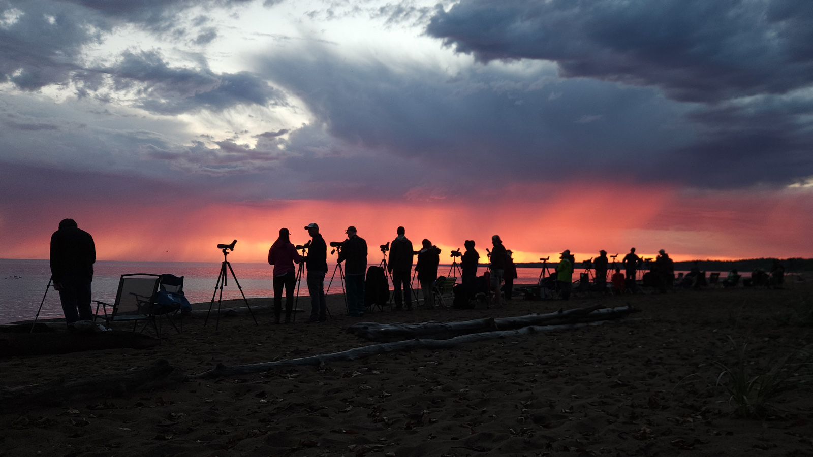 By around 10:15, we were noticing storm clouds gathering to the west, towards Duluth, with heavy rain below them – and it was apparent that they would be heading our way. We soon began grabbing our scopes and chairs, and began to clear the beach as it approached. The thunder was nearly continuous as we all climbed into our cars to wait it out, and very soon the downpour arrived!