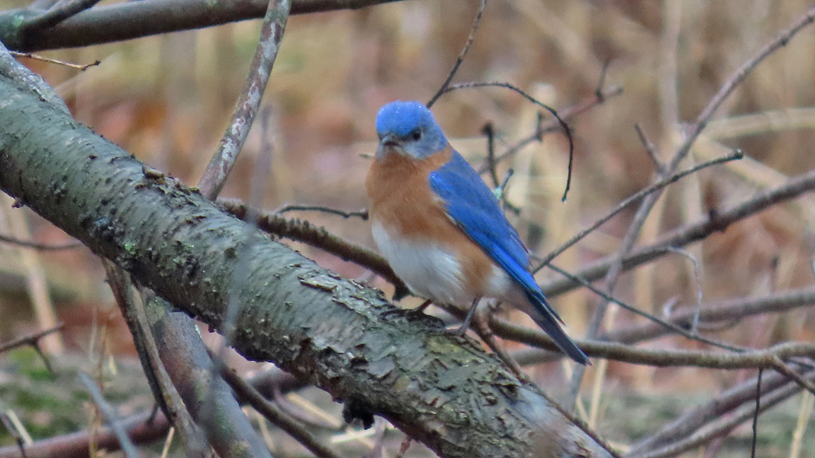 Most prominent in the open forest was a nice group of EASTERN BLUEBIRDS, with at least 15 present. Woodland birds included RED-BELLED, DOWNY and HAIRY WOODPECKERS, NORTHERN FLICKER, BLACK-CAPPED CHICKADEE, WHITE-BREASTED and RED-BREASTED NUTHATCHES, a BROWN CREEPER, BLUE JAYS, and AMERICAN CROWS. Briefly spotted in the trees, but unfortunately missed by many, was one of our target birds — a GREAT TIT. Other birds included CANADA GOOSE, a flyover COMMON MERGANSER, KILLDEER, a GREAT BLUE HERON, and a BALD EAGLE, and heard in the distance was a pair of SANDHILL CRANES.