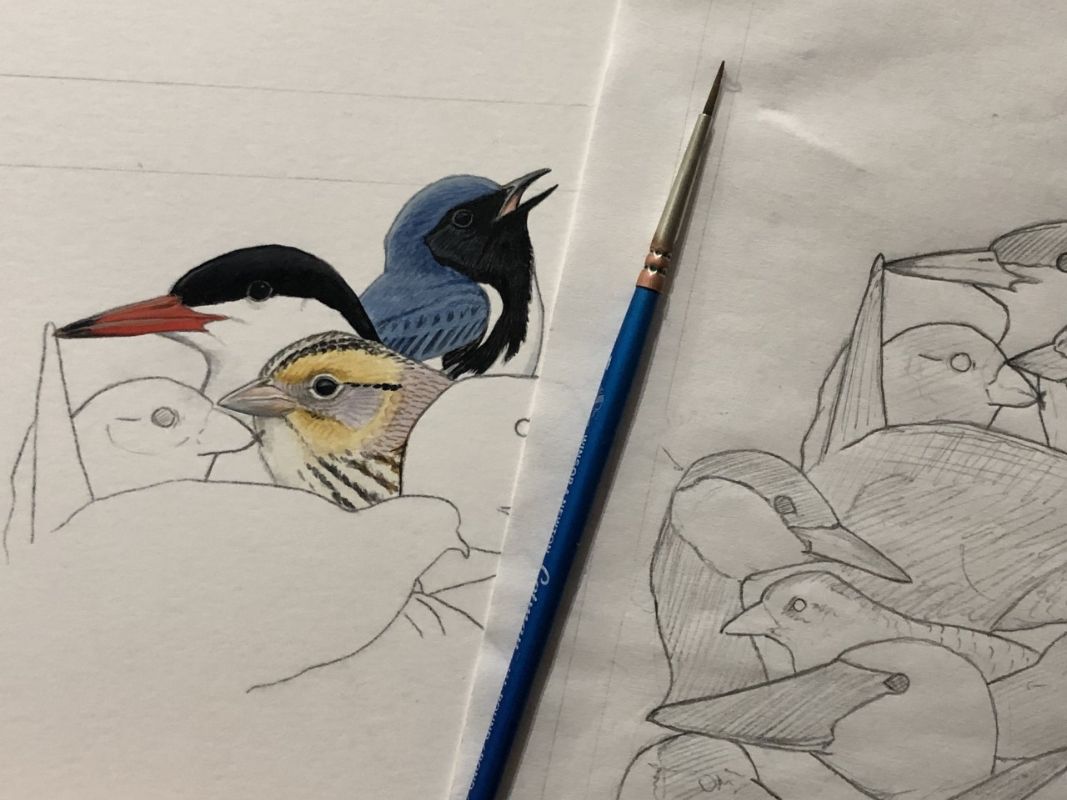 Here you can see the northwest corner beginning to be painted, where the Black-throated Blue Warbler forms the Bayfield Peninsula, and the tip of the Common Tern’s bill meets the tail of the Sharp-tailed Grouse in the city of Superior.