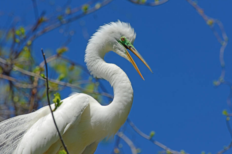If you hear a croaking sound, much like a pepper grinder, then it’s possible that you’re in the presence of the Great Egret. Its pure white plumage, yellow beak, and long black legs are very important symbols in the birding community, as it is the mascot of the National Audubon Society.