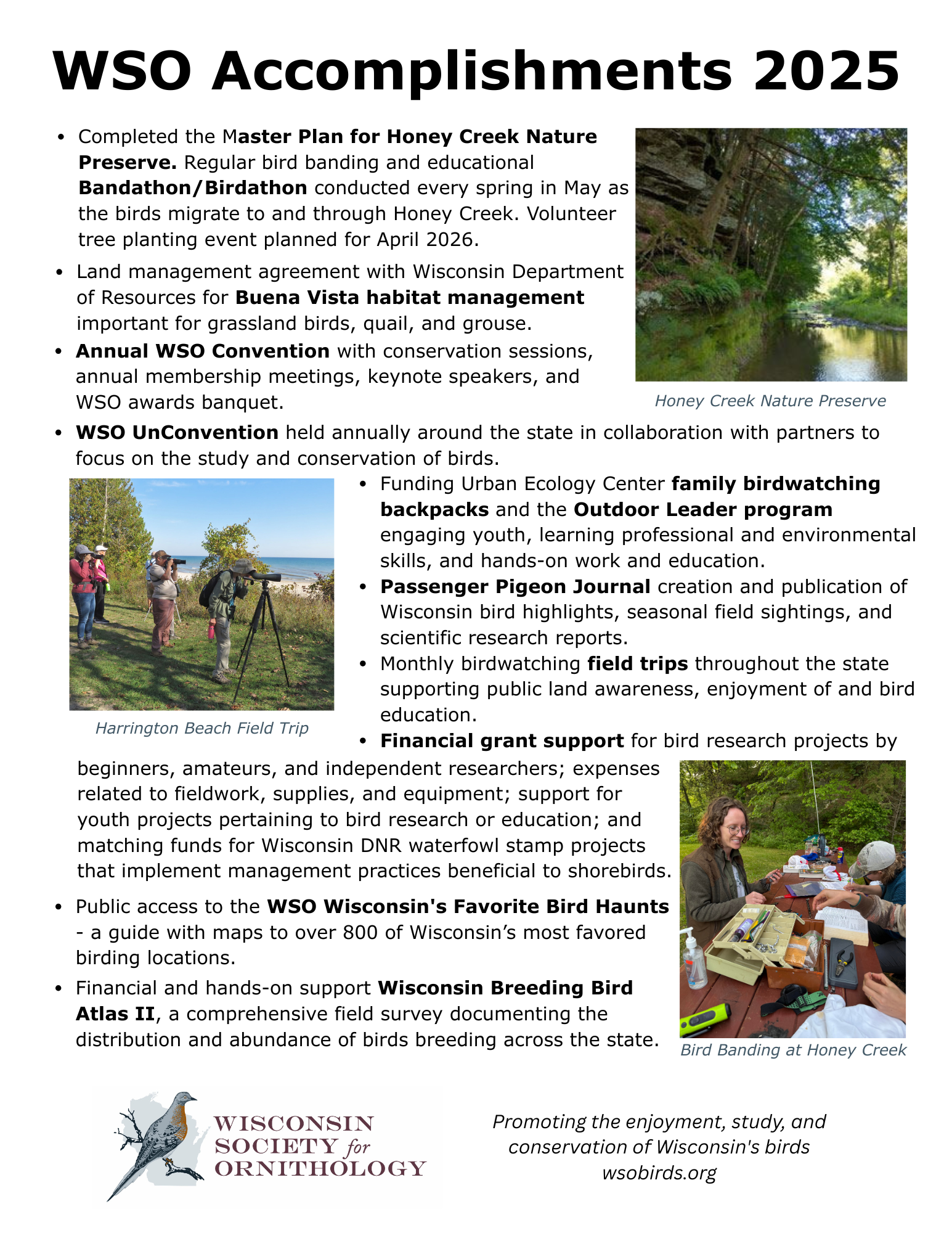 You can make a difference today. Please consider donating to the Wisconsin Society for Ornithology and help us continue to protect and celebrate the birds that bring so much beauty and joy to our world. Together, we can ensure their songs never fade.